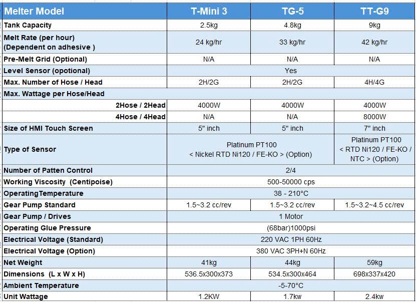 Máy keo nóng chảy dòng TT là một công cụ nhỏ gọn nhưng mạnh mẽ cho các dây chuyền tự động hiện đại. Có sẵn các mức công suất 3kg, 5kg và 9kg, máy phù hợp với các nhu cầu sản xuất khác nhau. Máy có thể được trang bị từ 2 đến 4 ống keo cho các công việc dán keo đa năng.