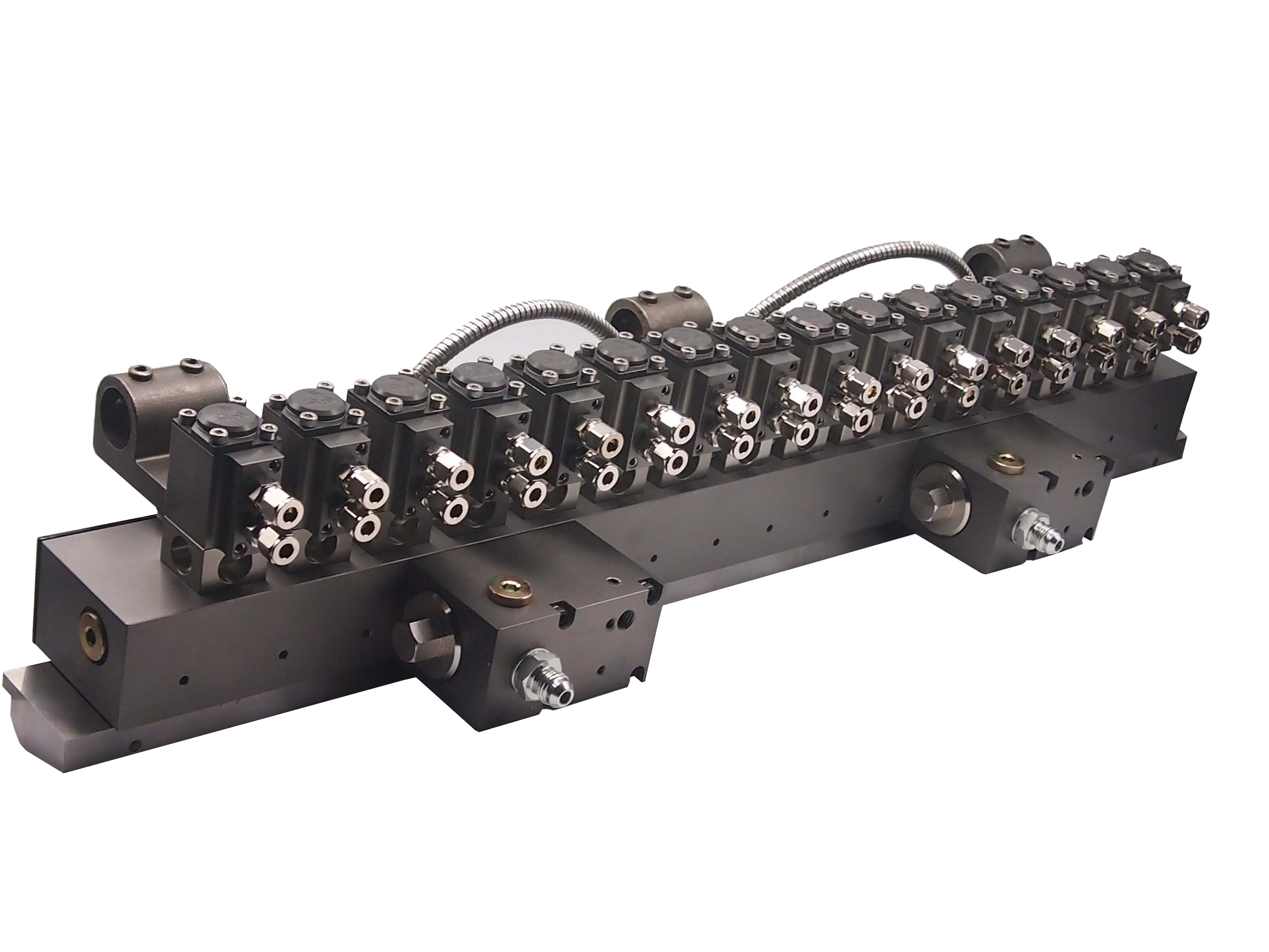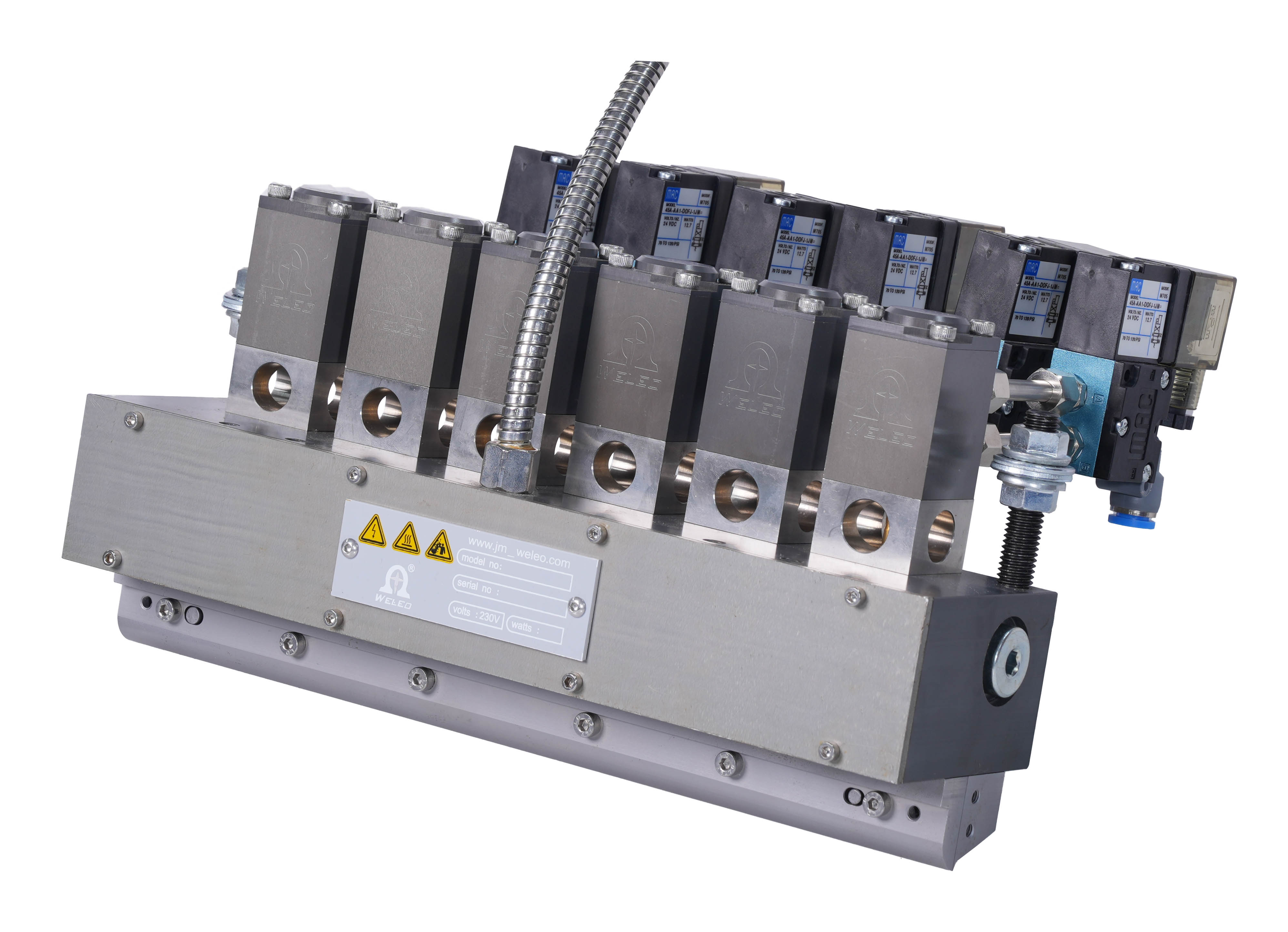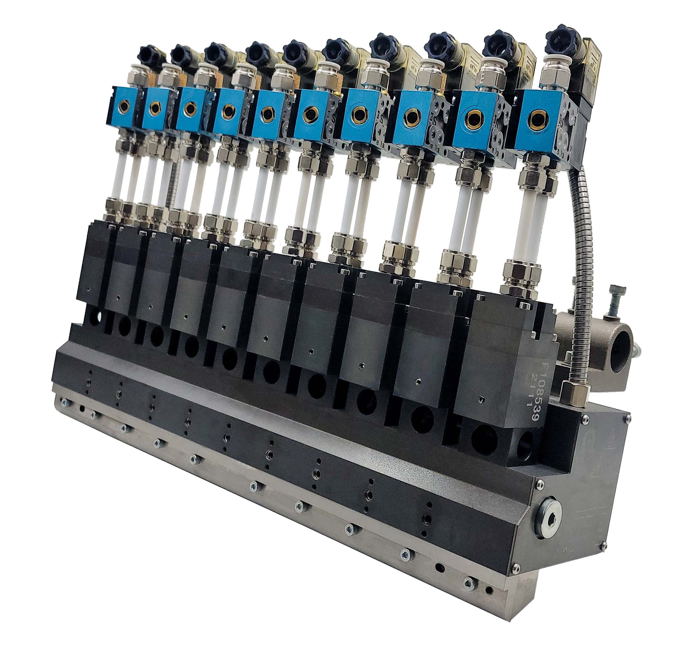 Đầu phun khuôn khe hở tốc độ cao ES serise, thân súng có khối lọc độc lập, có thể lắp đặt theo nhiều hướng, kết nối với đầu vào ống mềm. Mỗi mô-đun súng phun được đóng mở bằng mô-đun khóa áp suất khí nén. Lò xo được sử dụng để giữ kim đóng khi không có áp suất khí nén cung cấp cho đầu phun. Mỗi mô-đun tốc độ cao ES được lắp phía trên đầu phun và mép phun được lắp ở phía dưới đầu phun để điều khiển trực tiếp quá trình phun gián đoạn. Bộ gia nhiệt đầu súng giữa các mô-đun cung cấp khả năng gia nhiệt trung bình và điều khiển nhiệt độ chính xác bằng cảm biến Pt100/Ni120 tương thích.